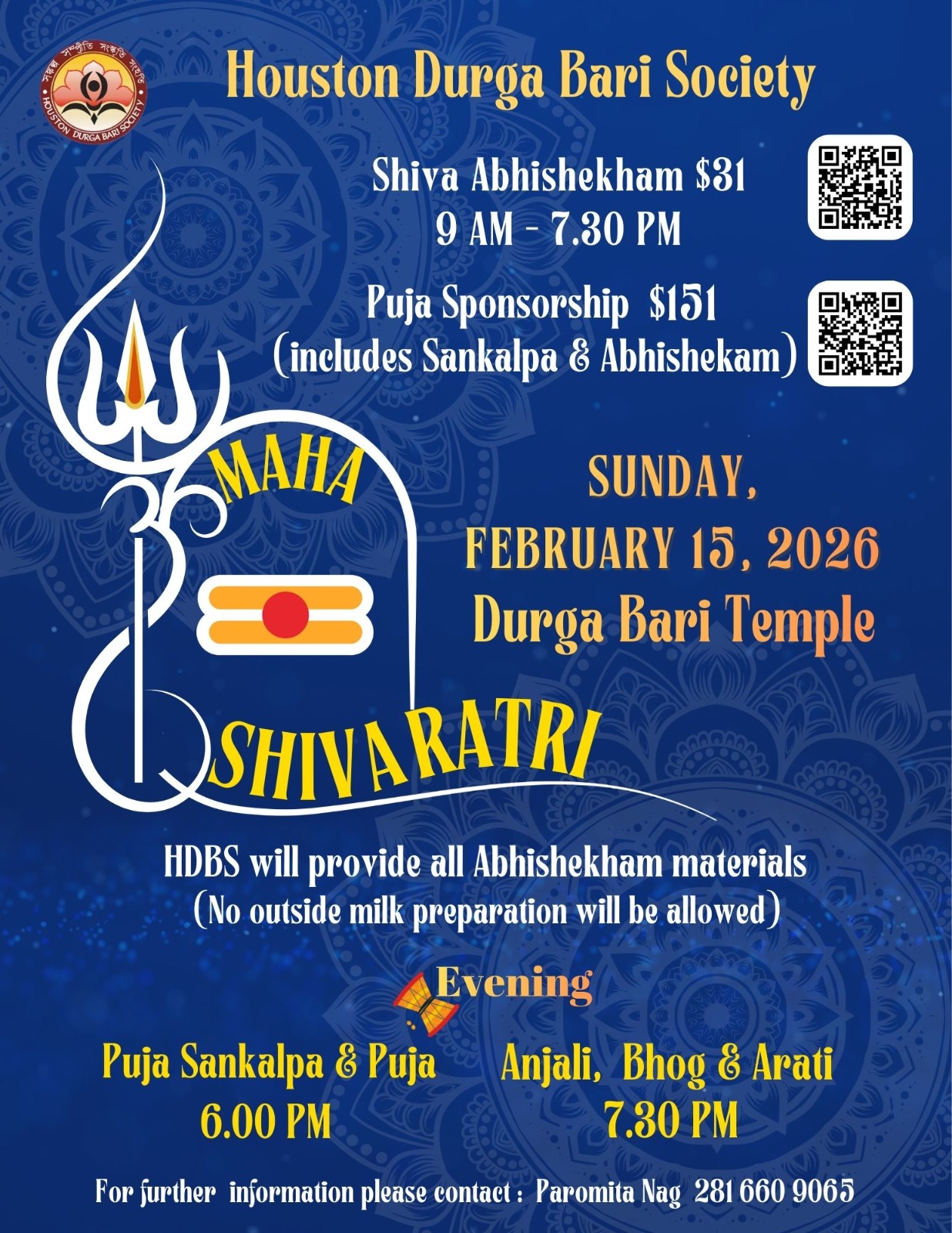 Venue: Houston Durgabari Society Temple Time: 2/15/26 9:00 am - 2/15/26 9:00 pm Hosted By: Houston Durgabari Society