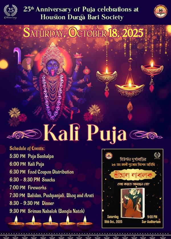 Venue: HDBS Time: 10/10/25 5:00 pm - 10/18/25 11:00 pm Hosted By: HDBS 2025 Puja Committee